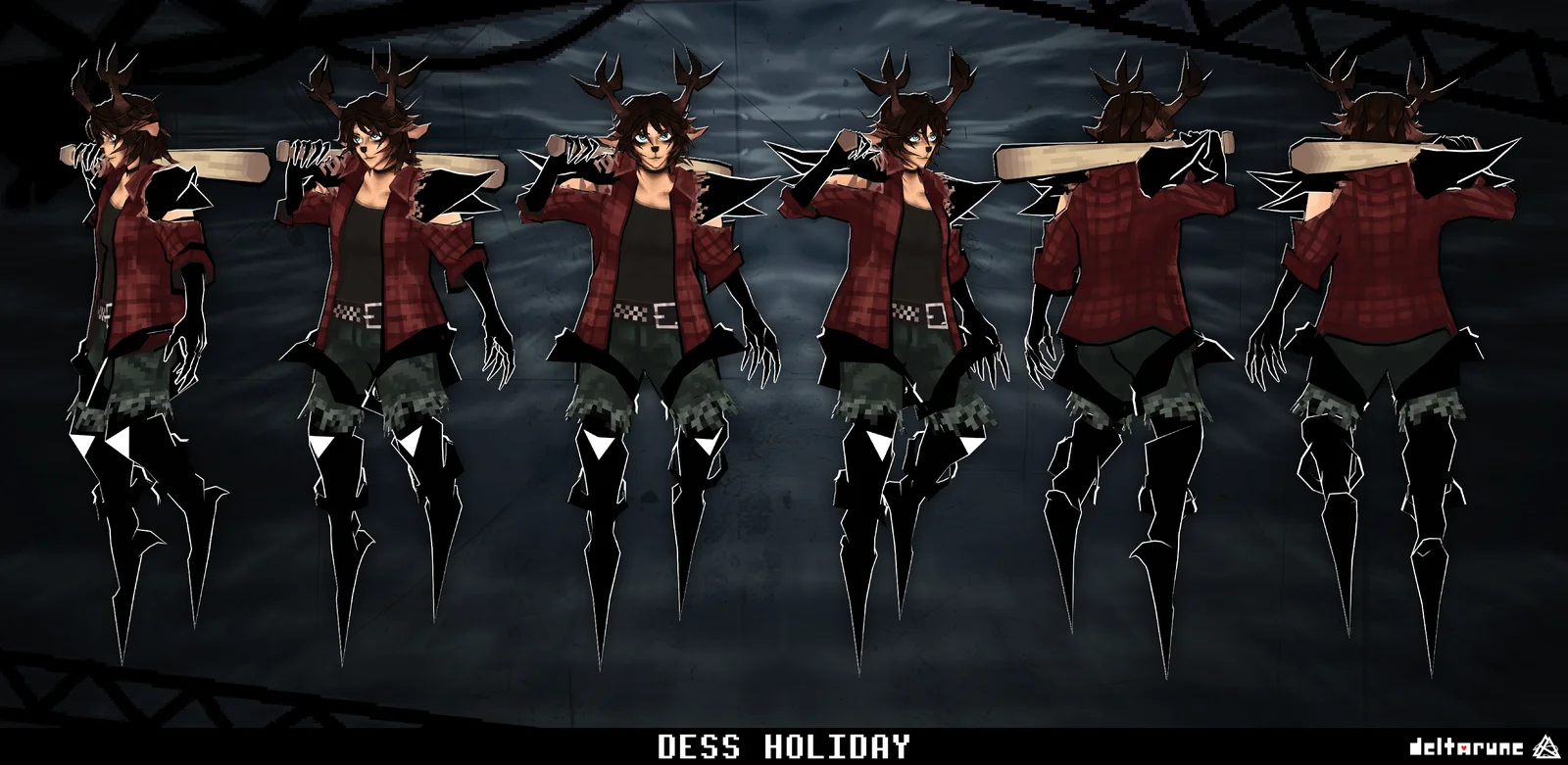 A fully rigged 3D character model featuring an original design inspired by Dess Holiday and the Roaring Knight from Deltarune. The rig includes multiple bone groups and a slider-based facial setup utilizing shape keys for animation. Available facial controls cover blinking, eyebrow movement, visemes (A, E, I, O, U), and various predefined expressions. The hierarchy allows users to optionally toggle the character's outline and an included bat prop.