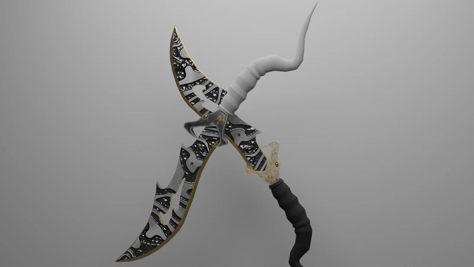 This asset provides 3D models of demon-themed daggers. The package includes a predefined black and white gold material setup along with two texture maps. The original Substance Painter files are also provided, allowing users to modify the base textures and customize the materials for their specific project requirements.