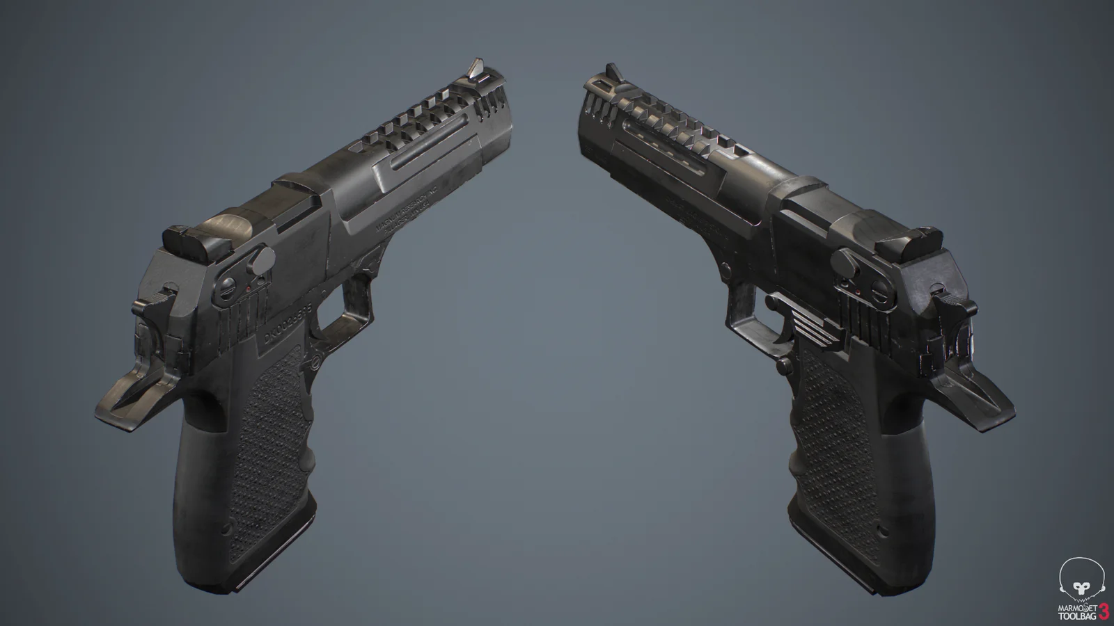 A realistic 3D model of an aluminum Desert Eagle L5 with a .357 barrel, optimized for first-person shooter games. The asset includes both high-poly and low-poly versions, with the low-poly mesh sitting at 13,000 triangles and the high-poly mesh at 40,000 triangles before subdivision. It features properly packed UVs on a single channel and comes with a 4K PBR metallic-roughness texture set.