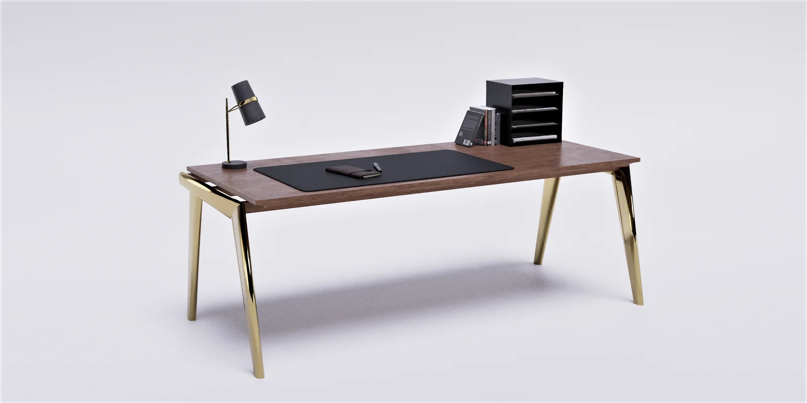 A realistic 3D model of a desk designed for architectural visualization and interior scenes. The asset comes fully textured and is populated with decorative accessories, including a lamp, a desk organizer, books, a notepad, and a pen. The scene is provided as a native Blender file.