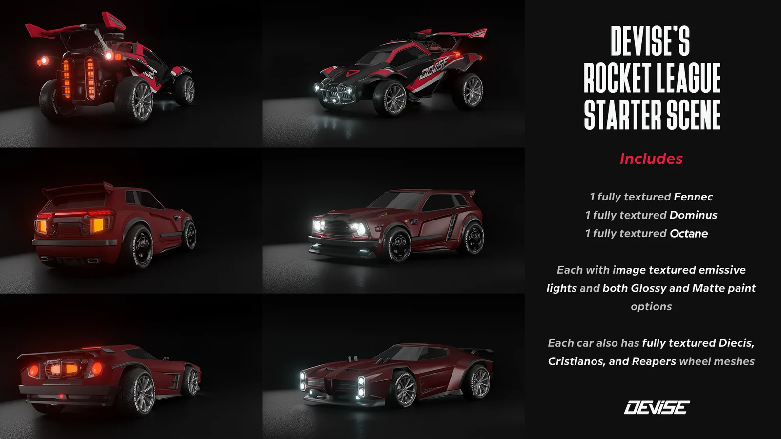 This asset pack provides a collection of fully textured Rocket League vehicle models, including the Octane, Fennec, and Dominus. Each car is equipped with image-textured emissive lights and customizable paint materials, offering glossy, metallic, and matte finish options. The package also includes three distinct wheel meshes: Diecis, Cristianos, and Reapers. Included shader node setups allow users to apply procedural mud effects to the Cristiano and Dieci wheels. Additionally, the asset provides exported FBX files for each car equipped with Cristiano wheels.