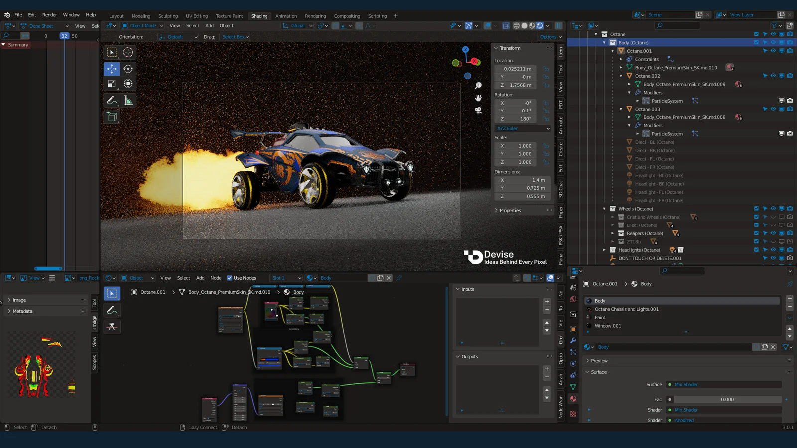 This starter scene provides a ready-to-use environment featuring three fully textured Rocket League vehicles: the Octane, Fennec, and Dominus. Each car includes image-textured emissive lights and customizable paint finishes, including anodized, glossy, matte, and metallic options. Users can apply and test both custom and in-game decals directly on the vehicles. The scene also features Dieci, Cristiano, and Reaper wheel meshes, with node-based mud shaders available for the Cristianos and Diecis. Additionally, an Alpha Boost particle emission setup is included for each car.