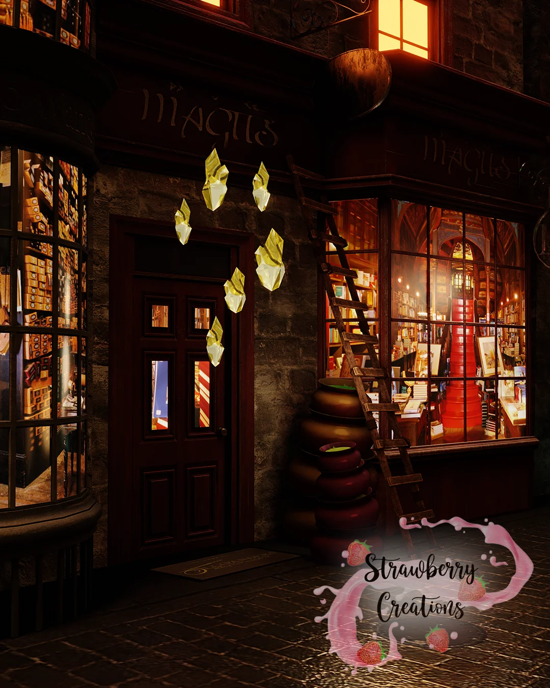 A pre-built 3D environment depicting a Christmas-themed version of Diagon Alley and Knockturn Alley. The scene is configured for compatibility with both EEVEE and Cycles render engines, and includes a customizable lighting setup.