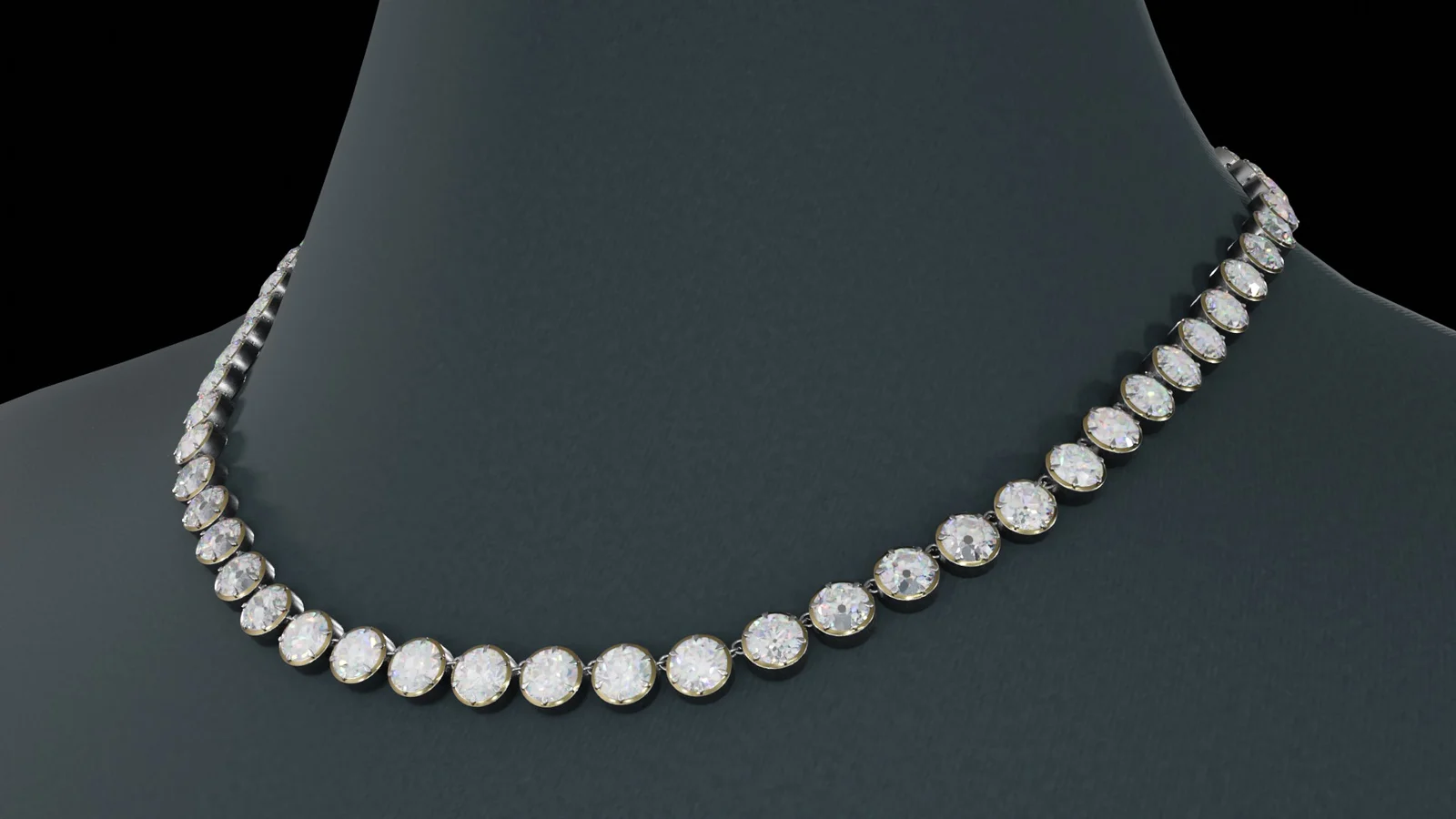 This product provides a complete, render-ready setup demonstrating gemstone materials. The environment includes a 3D model of a bust wearing a diamond necklace, complete with pre-configured animation data. The core component is a custom dispersion shader designed specifically for the Cycles render engine, which simulates the realistic splitting of light through the diamond geometry.