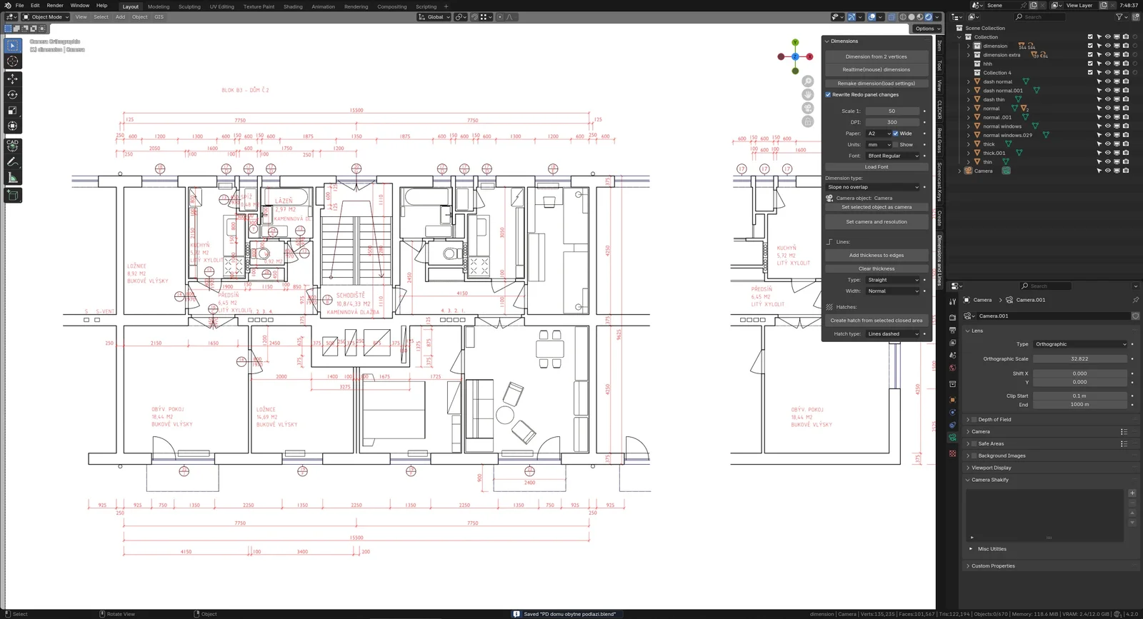 The add-on includes camera setup features that automatically configure render resolutions based on specific paper sizes and DPI requirements for print-ready layouts. It also provides multiple line styles and hatch patterns tailored for architectural sections, schematic views, and blueprint-style rendering. Both metric and imperial units are supported.