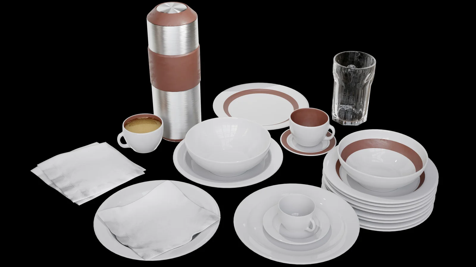 This collection contains a variety of tableware models provided in a single Blender file. The set includes two cups, a thermos bottle, a drinking glass, two flat plates, two deep plates, two small plates, two large soup bowls, a napkin model, and a cup of tea. The included materials are structured to allow for straightforward color customization.