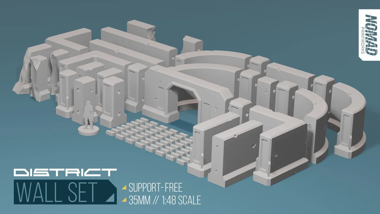 A set of 3D printable modular walls designed for 35mm (1:48 scale) tabletop environments. The pieces connect using a peg system to form custom town defenses or barriers. The models are optimized for FDM 3D printing and can be printed entirely without supports. The set also includes an optional poster file for texturing or detailing.