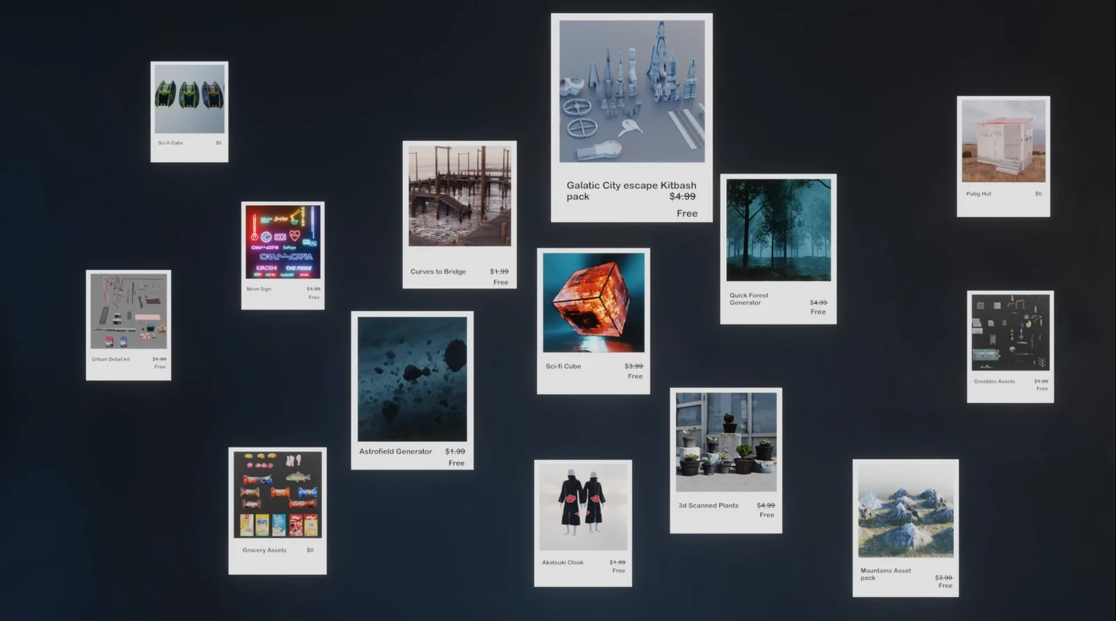 Included in the package are procedural tools like geometry node generators for quick forest creation, curve-to-bridge structures, and celestial astrofields. On the asset side, it provides 3D scanned plants and objects, urban kitbash elements like garbage and neon signs, sci-fi cityscape components, mountain backdrops, and assorted grocery items.