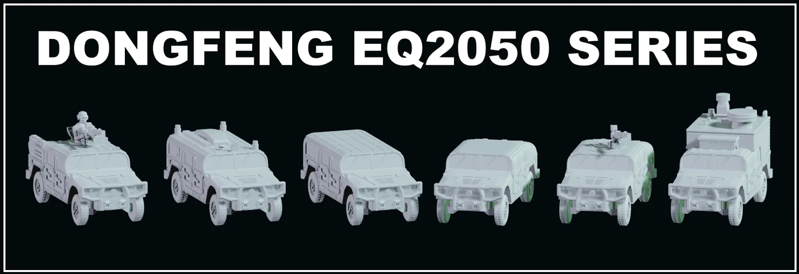 This collection contains 3D printable models of the Dongfeng EQ2050 series vehicles, scaled to 1/100 for 15mm tabletop applications. The set includes six different versions of the vehicle across seven chassis variations, featuring details such as an optional droppable window setup.