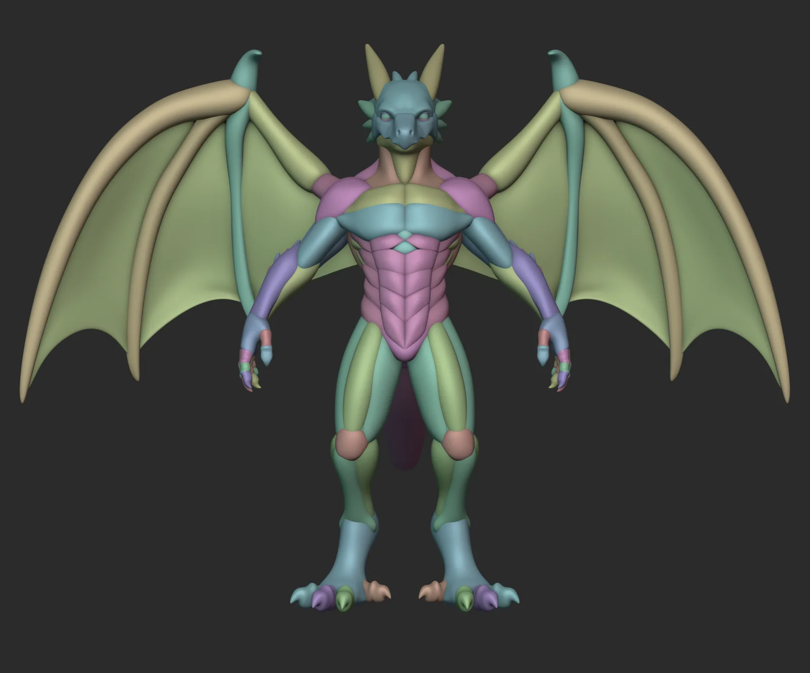 This is a stylized dragon character blockout intended to serve as a starting point for sculpting or further modeling projects. The base mesh includes distinct parts for the torso, head, hand, and leg. In the provided Blender file, these body parts remain separate objects to facilitate easier adjustment, whereas the FBX and OBJ formats feature the parts joined into a single mesh.
