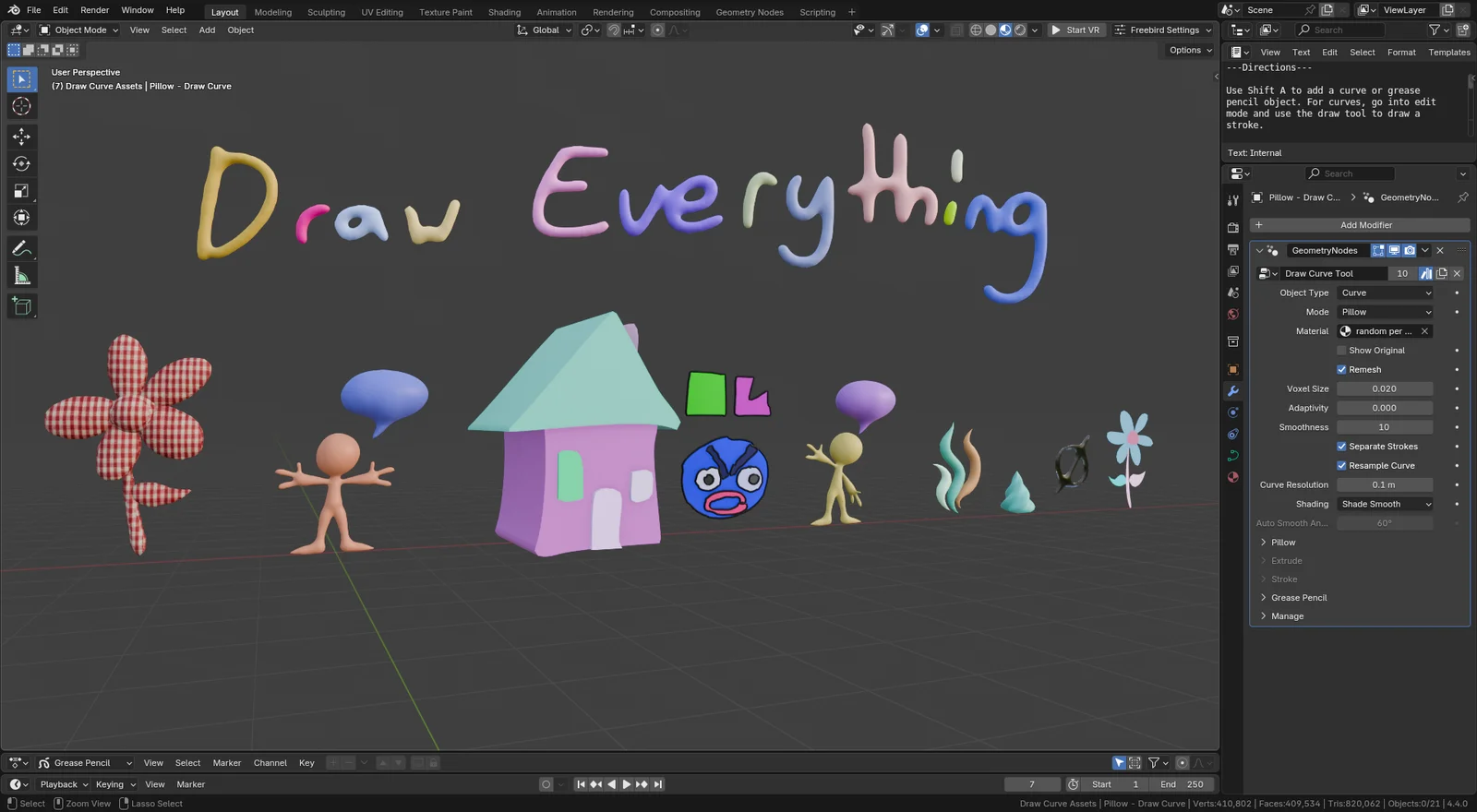 A Geometry Nodes system that generates 3D meshes directly from drawn curves and Grease Pencil strokes. The tool provides six distinct generation modes: Pillow for inflated shapes based on edge distance, Extrude for flat depth, Stroke for adjustable thickness with remeshing support, Flat for n-gon fills, and combination modes.