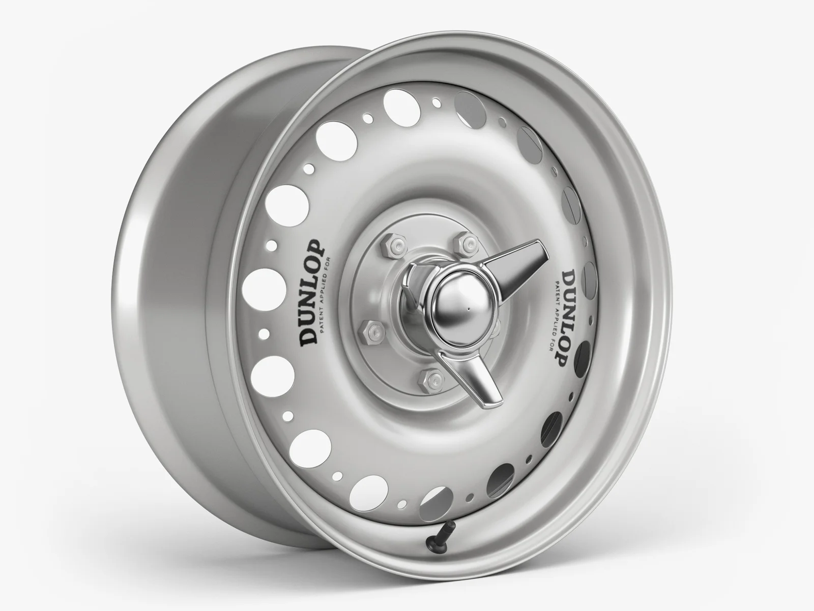 A highly detailed 3D model of a 15x7-inch Dunlop D-Type racing wheel, built to real-world scale. The model is centered on the origin and includes base geometry of 16,477 polygons, designed to subdivide to 263,632 polygons for smooth renders. It is provided in format-agnostic FBX and OBJ files, along with an alpha texture map.