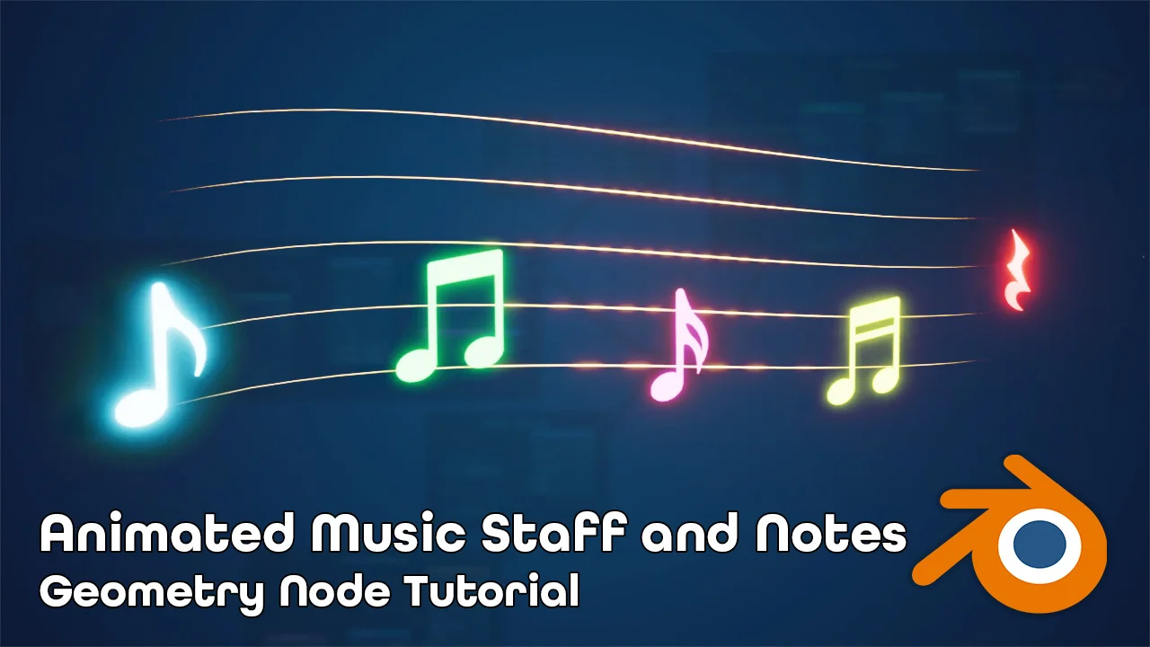 A step-by-step Blender tutorial teaching how to build an animated music notation system from scratch using Geometry Nodes. The guide explains how to spawn musical notes and staff lines along a custom user-drawn curve with progressive appearance and disappearance animations.