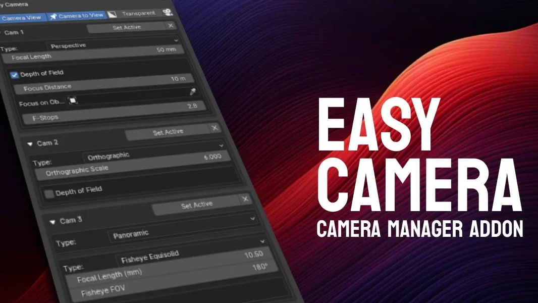 Easy Camera is a Blender add-on that centralizes camera management and frequently used settings into a single N-Panel menu. It allows users to quickly add new cameras at their current viewport perspective, switch between multiple cameras, and set the active camera without navigating the Outliner. The interface includes direct toggles for Camera View, Camera to View movement, and background render transparency. Users can also adjust the camera type, switching between perspective, orthographic, and panoramic modes, and manage depth of field directly from the panel.