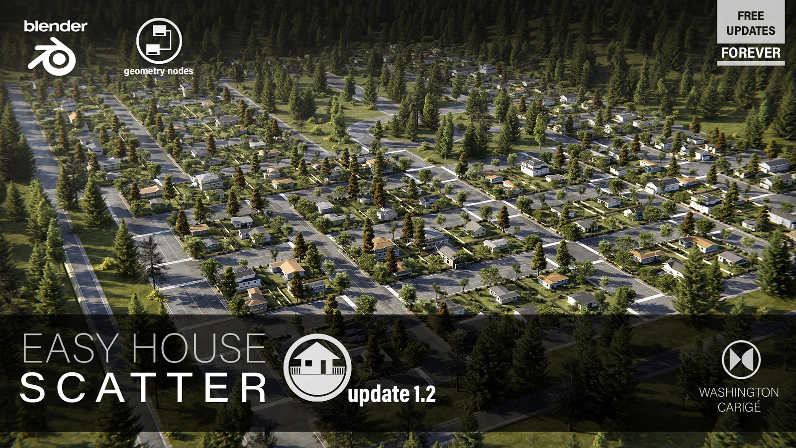 This is a geometry nodes system designed for scattering houses along faces to generate large neighborhood environments. It includes ten North American style house models, along with supplementary environmental elements such as bushes, trees, fences, and soil. All included models are organized into standard Blender collections, allowing them to be used individually outside the scatter system.