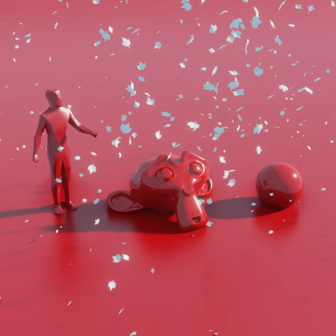 Users control the volume of the effect by adjusting a bounding box in Edit Mode, which the particles will automatically fill. While designed for blowing leaves, the system can be adapted for other ambient particle effects like falling snow, floating dust motes, rising embers, or flying insects by replacing the instanced objects. All controls for the effect are exposed in the modifier properties panel. Due to its procedural nature, the generated particles do not interact with or collide with other geometry in the scene.