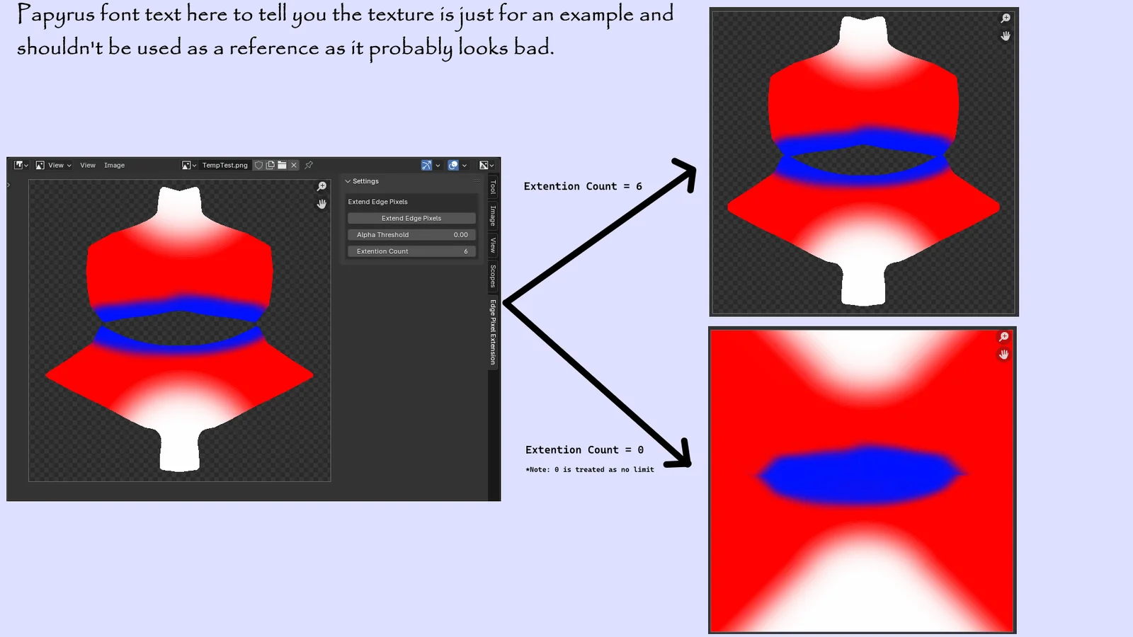 Edge Pixel Extension adds a panel to Blender's Image Editor that allows users to bleed or extend the edge pixels of a texture into transparent areas. This process helps prevent visible seams on models when viewed from a distance, ensuring texture data safely overlaps the boundaries of UV islands. The tool works by iteratively identifying transparent pixels and overwriting them with the average color of adjacent non-transparent pixels. Users can adjust the alpha threshold for transparency detection and specify the extension count to determine the exact pixel distance of the generated buffer.