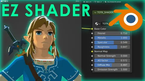 This EEVEE cell-shader provides a stylized look inspired by the shading found in Breath of the Wild and Tears of the Kingdom. The node setup exposes multiple controls for fine-tuning material properties in real-time. Users can input base colors or image textures, and adjust parameters for dynamic fresnel rim lighting, metallic, specular, and roughness values. The shader also includes inputs for normal maps, ambient occlusion factors, emission strength, and a diffuse mix for blending base colors with lighting. The material supports opacity mapping for transparency, which relies on configuring appropriate EEVEE blend modes and backface culling settings.