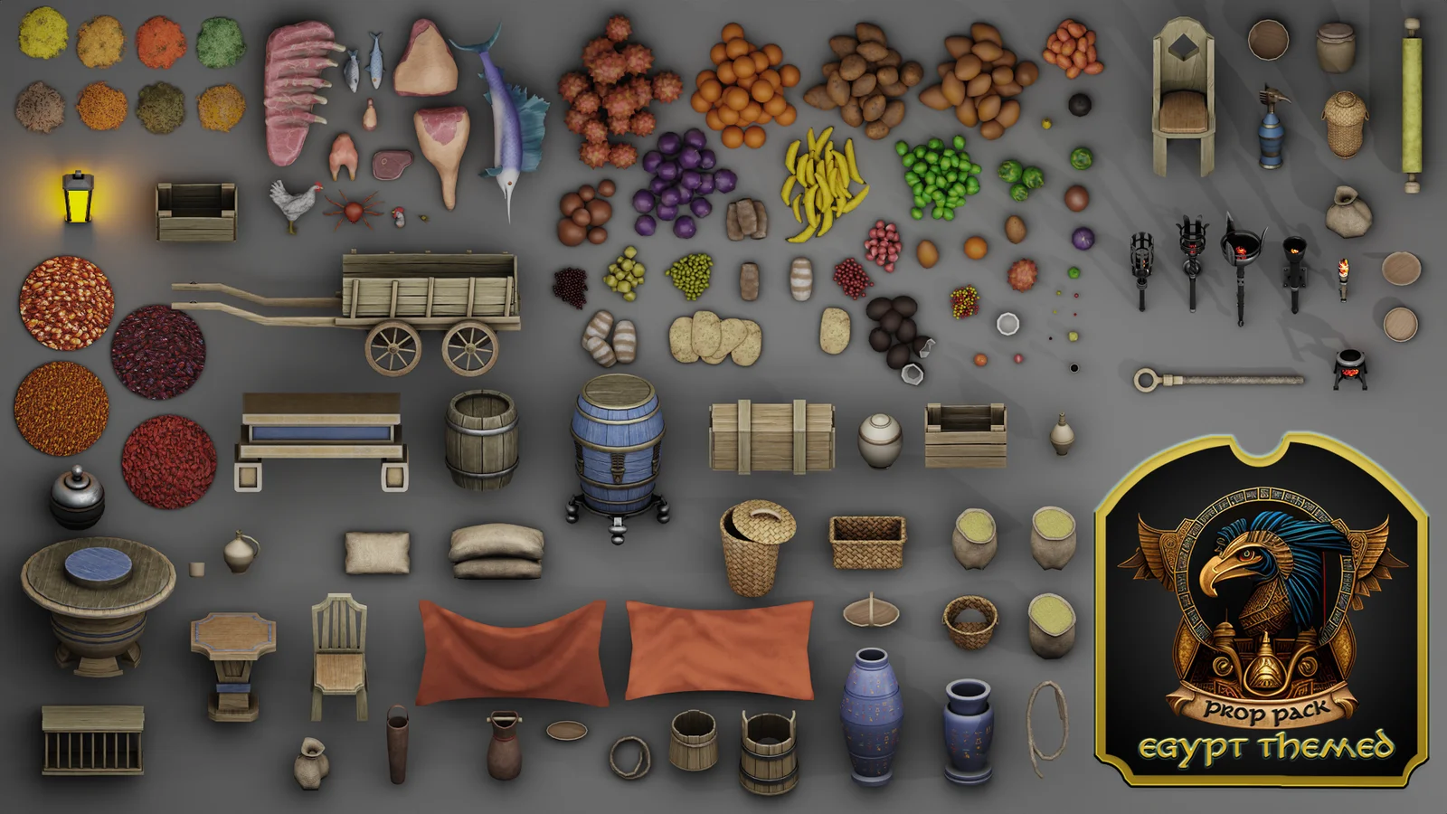 This asset pack contains 132 stylized 3D models designed for building ancient Egyptian environments, desert towns, and cities. The modular collection includes props suitable for market scenes and street layouts. The assets come fully textured with PBR materials utilizing 31 texture maps. The pack is provided in both Blender and Unreal Engine 5 project formats.