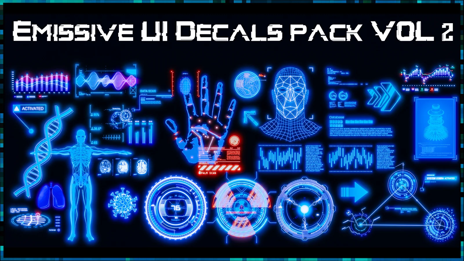 This collection provides 116 high-resolution emissive UI decals for hard surface modeling, environment design, and concept art workflows. The decals feature customizable colors and toggleable emission settings to suit different scene requirements.