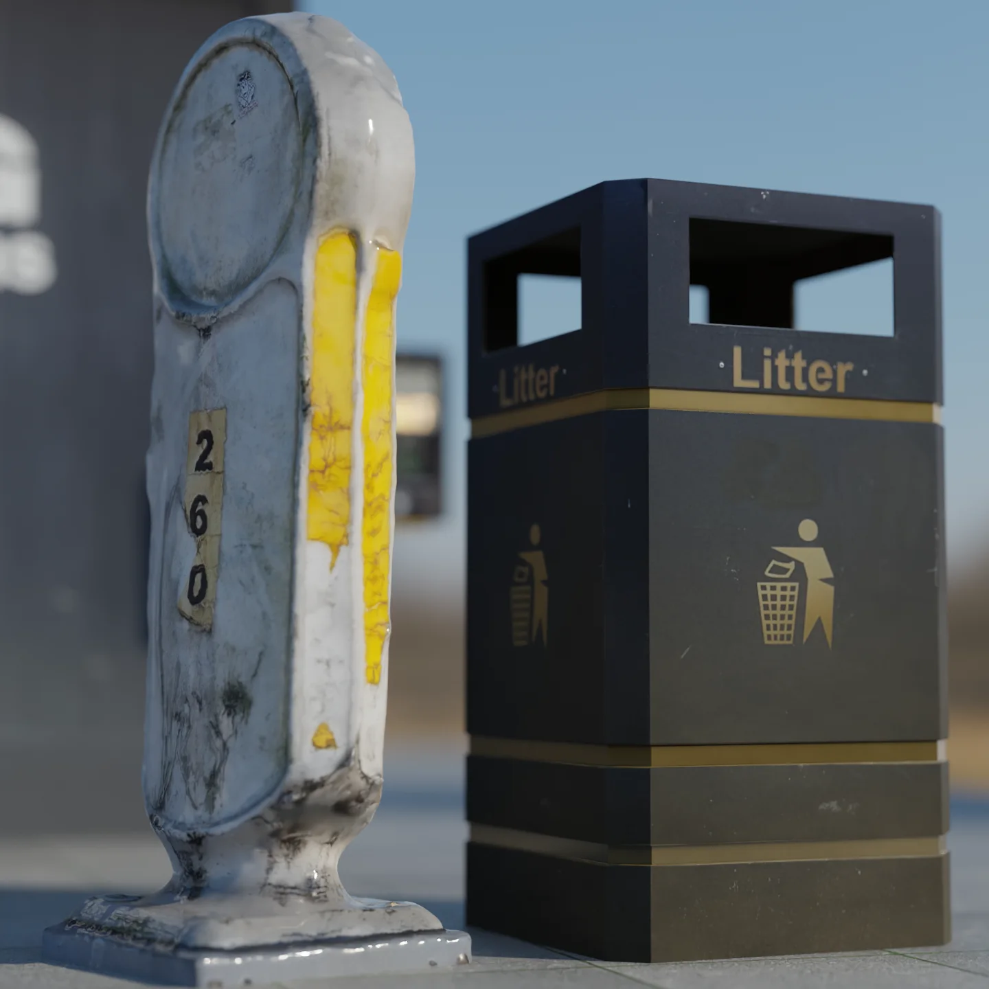 In addition to the 3D props, the pack contains two unique pavement textures for ground surfaces. It also features custom shader node groups that enable users to apply dynamic rain and dirt effects to their materials.