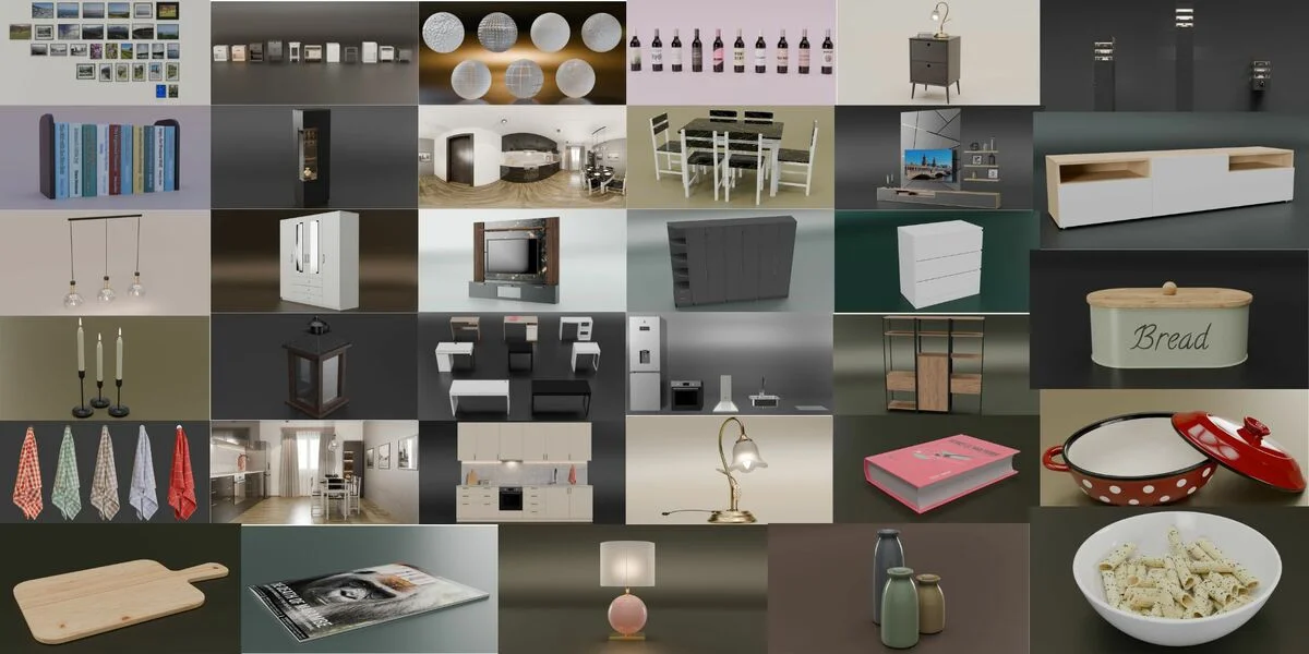 This bundle provides a collection of realistic 3D models designed for interior architectural visualization and product rendering. The included assets range from furniture pieces like nightstands and wardrobes to smaller props such as lamps, books, electronic appliances, wine bottles, and kitchen accessories.