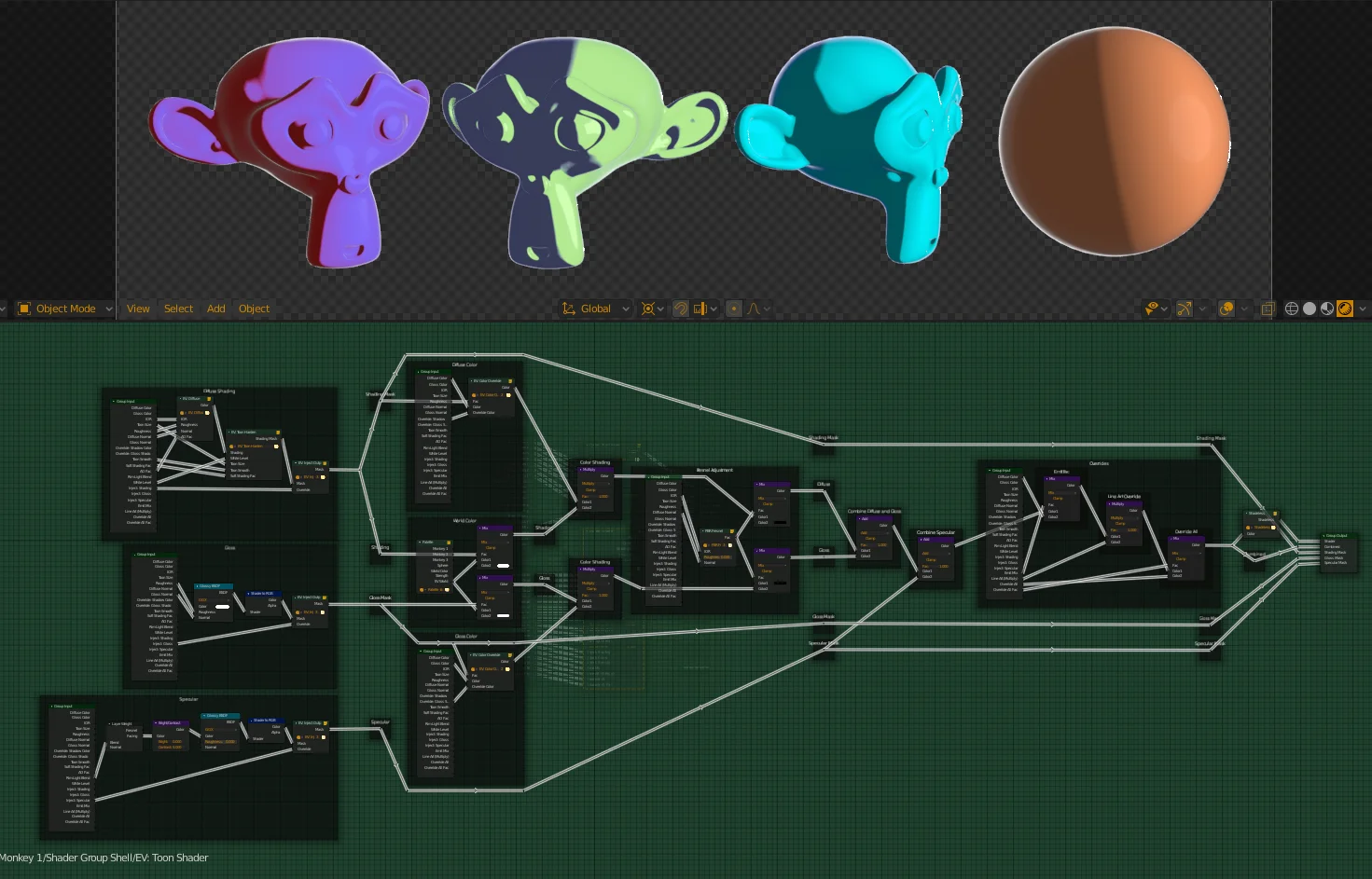 A toon shader node group designed specifically for Blender's EEVEE render engine. The material setup utilizes the Shader to RGB and Rescale nodes to generate non-photorealistic cel-shaded surface effects.