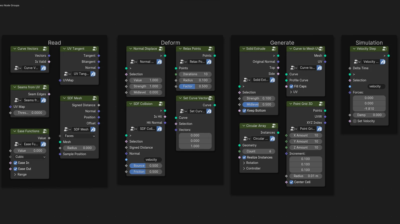 A collection of utility node groups designed to simplify common tasks in Blender's Geometry Nodes. The assortment includes tools for geometry manipulation, such as a circular array generator, solid extrusion, and simple normal displacement. It also features simulation-focused nodes like velocity stepping and signed distance field (SDF) collision responses. Additional utilities cover UV mapping operations, point relaxation, and mathematical easing functions for procedural animation. These assets can be integrated into the Blender asset browser for quick search and reuse across projects.
