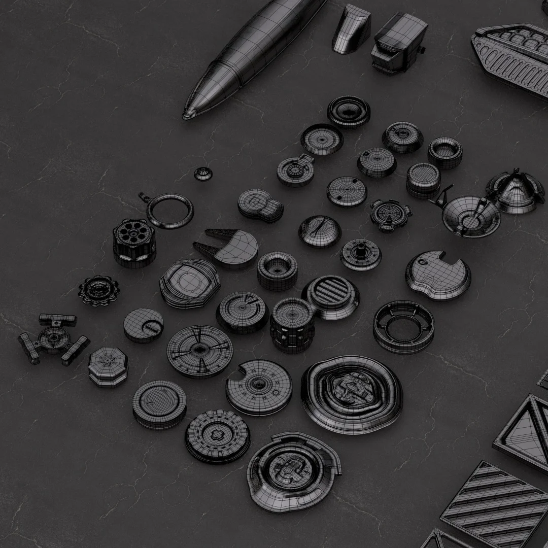 Everyday Hard Surface Kitbash provides a library of more than 300 individual models designed for high-poly detailing. The collection includes various panels, tubes, cables, and assorted mechanical parts suitable for augmenting concepts and complex hard-surface designs.