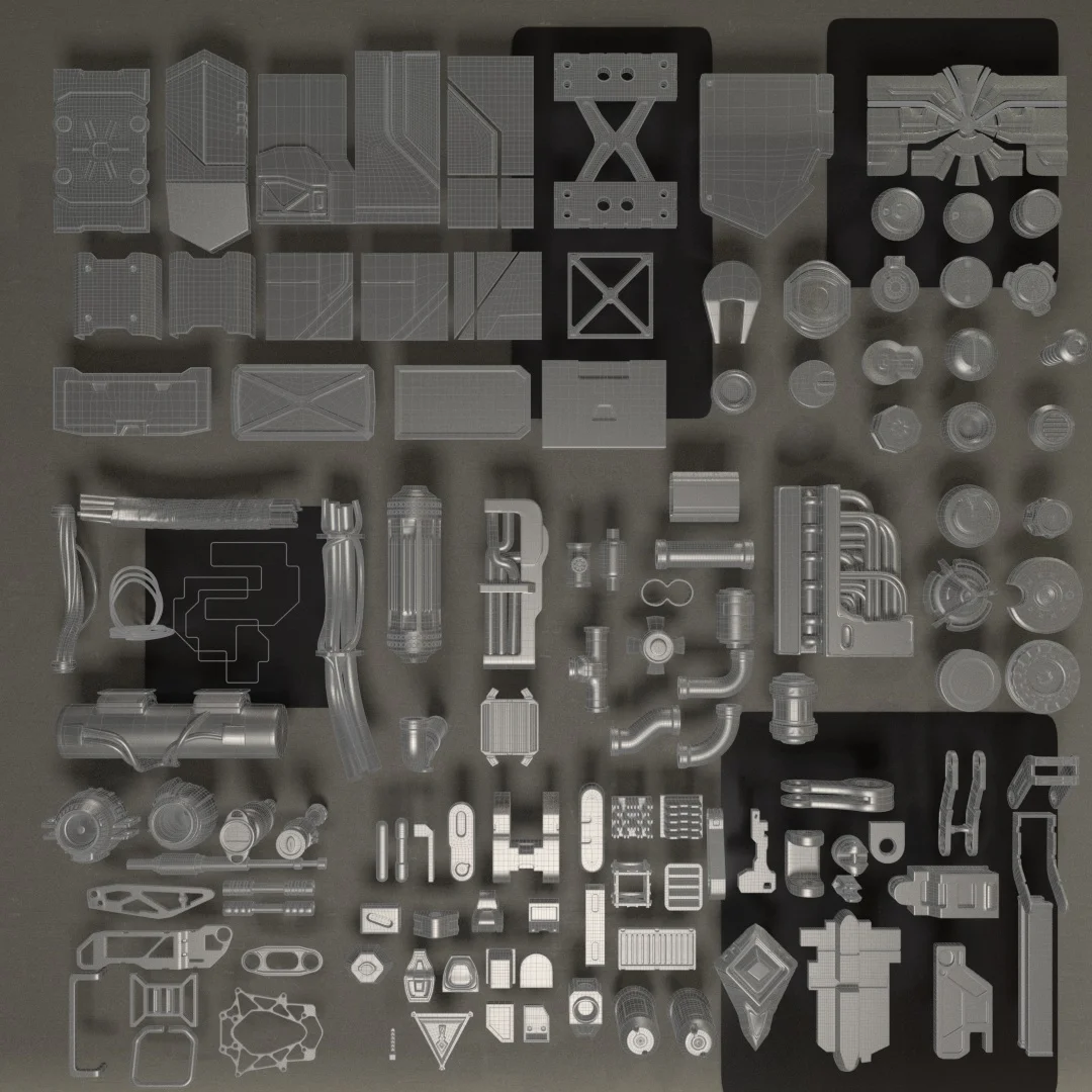 A collection of over 100 subdivision surface kitbash models designed for detailing high-poly geometry and concept art. The set includes a variety of panels, tubes, cables, and miscellaneous mechanical pieces. Models are provided in FBX format without pre-applied smoothing, allowing for flexible modifications and integration.