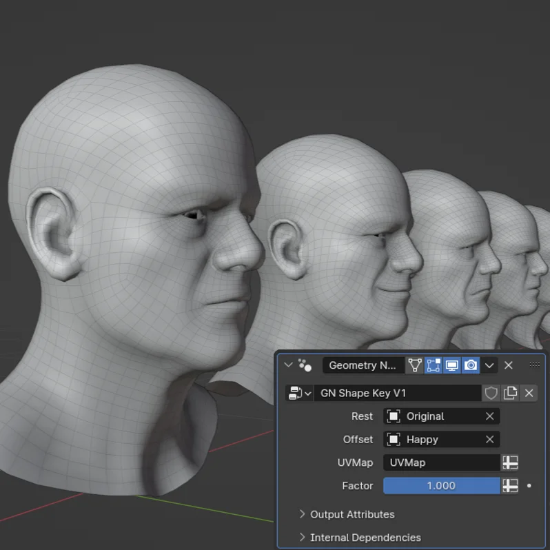 A geometry node setup designed to function as a shape key system. The node tree references secondary objects sharing identical topology to calculate and apply shape offsets to the base mesh. The file also includes a dedicated UV tangent node for handling tangent space offsets, which can be extracted and utilized independently in other procedural projects.