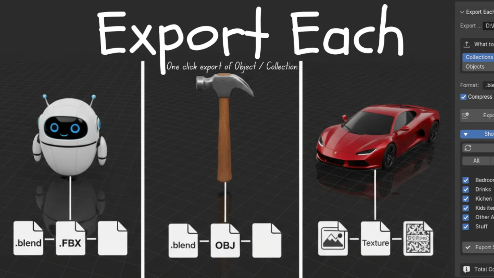 Export Each is an add-on that automates the process of exporting multiple objects or collections into separate files. It provides a dedicated panel in the 3D viewport for managing batch exports.