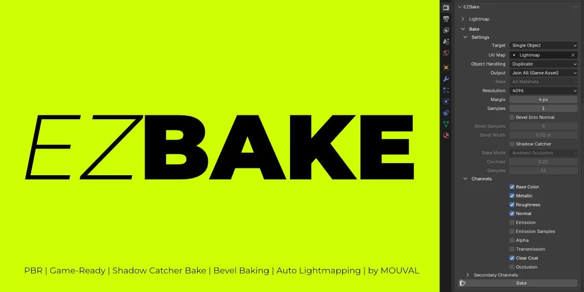 EZBake is an add-on that automates the process of baking complex Principled BSDF materials into optimized PBR texture maps. Located in the Render Properties panel, it is designed to prepare assets for game engines and real-time rendering by handling node setups, UV checks, and multi-material workflows.
