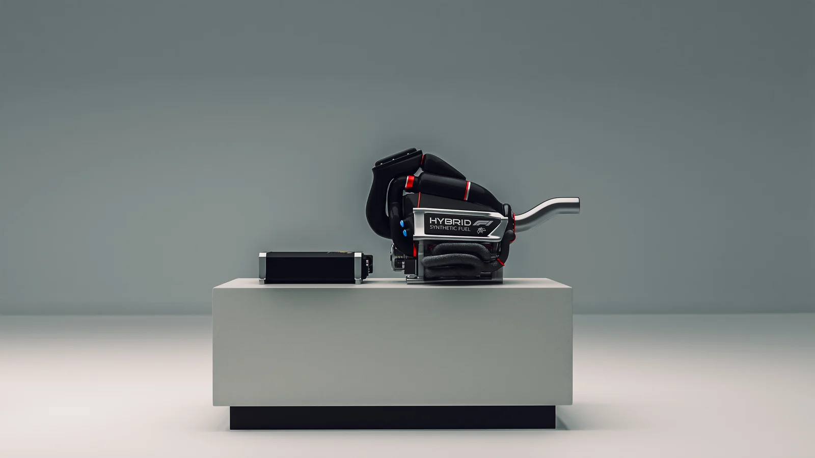 This is a 3D model of a Formula 1 power unit designed according to the 2026 engine regulations, modeled natively in Blender. The engine block is designed with a mirrored layout compared to older iterations, positioning the electronics at the front of the assembly.
