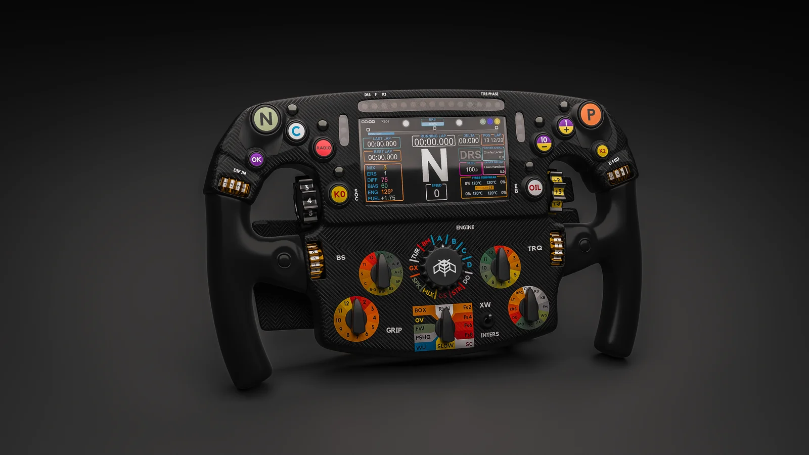 A 3D model of a Formula 1 steering wheel created in Blender. The asset features customizable elements, allowing users to easily swap the central logo and display screens with custom images.
