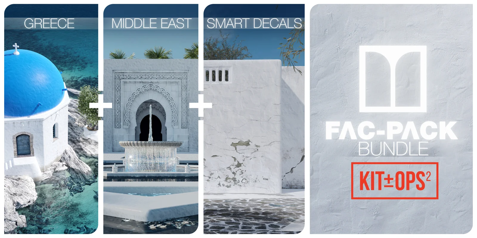 This bundle provides a collection of architectural exterior assets designed for use with the KitOps addon in Blender. It combines the Greece, Middle East, and Smart Decals asset packs into a single insert library compatible with both Cycles and EEVEE render engines.