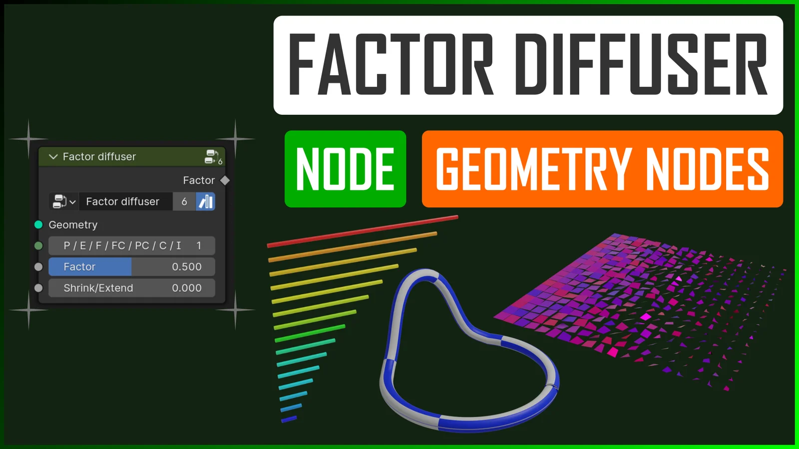 Factor Diffuser is a geometry node group that distributes a value from zero to one across different geometry domains. Users can choose to apply this distribution to points, edges, faces, face corners, control points, curves, or instances.