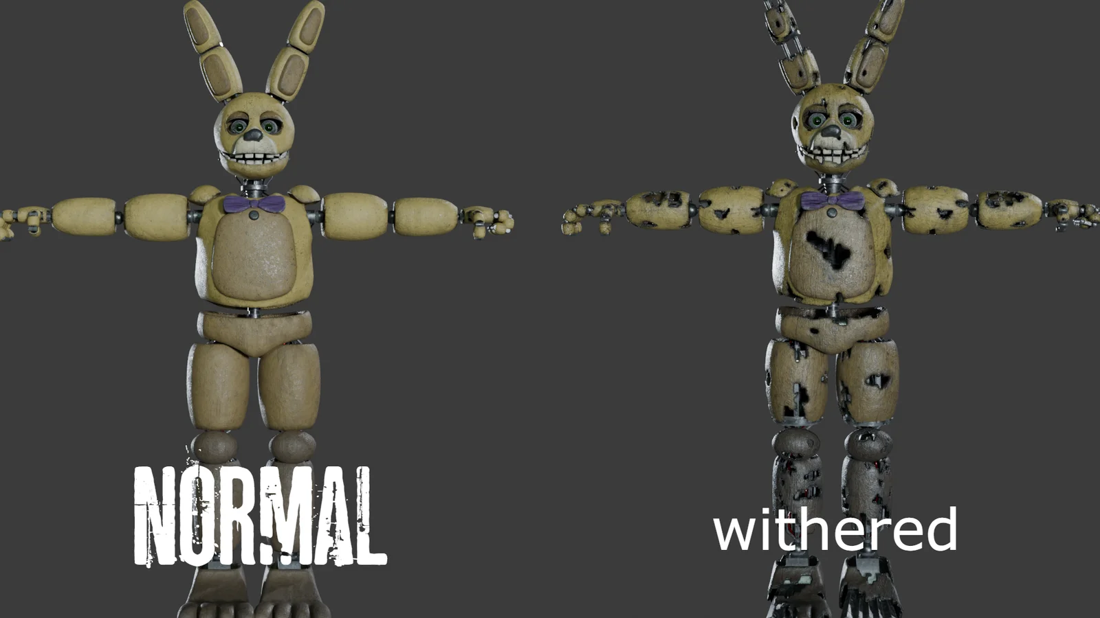 A retextured version of the v6 Springbonnie 3D model originally created by Failz. The release includes fully rigged models for both the standard Springbonnie and the Withered Springbonnie character variations. Select parts of the mesh have been retopologized to improve the topology of the original base.