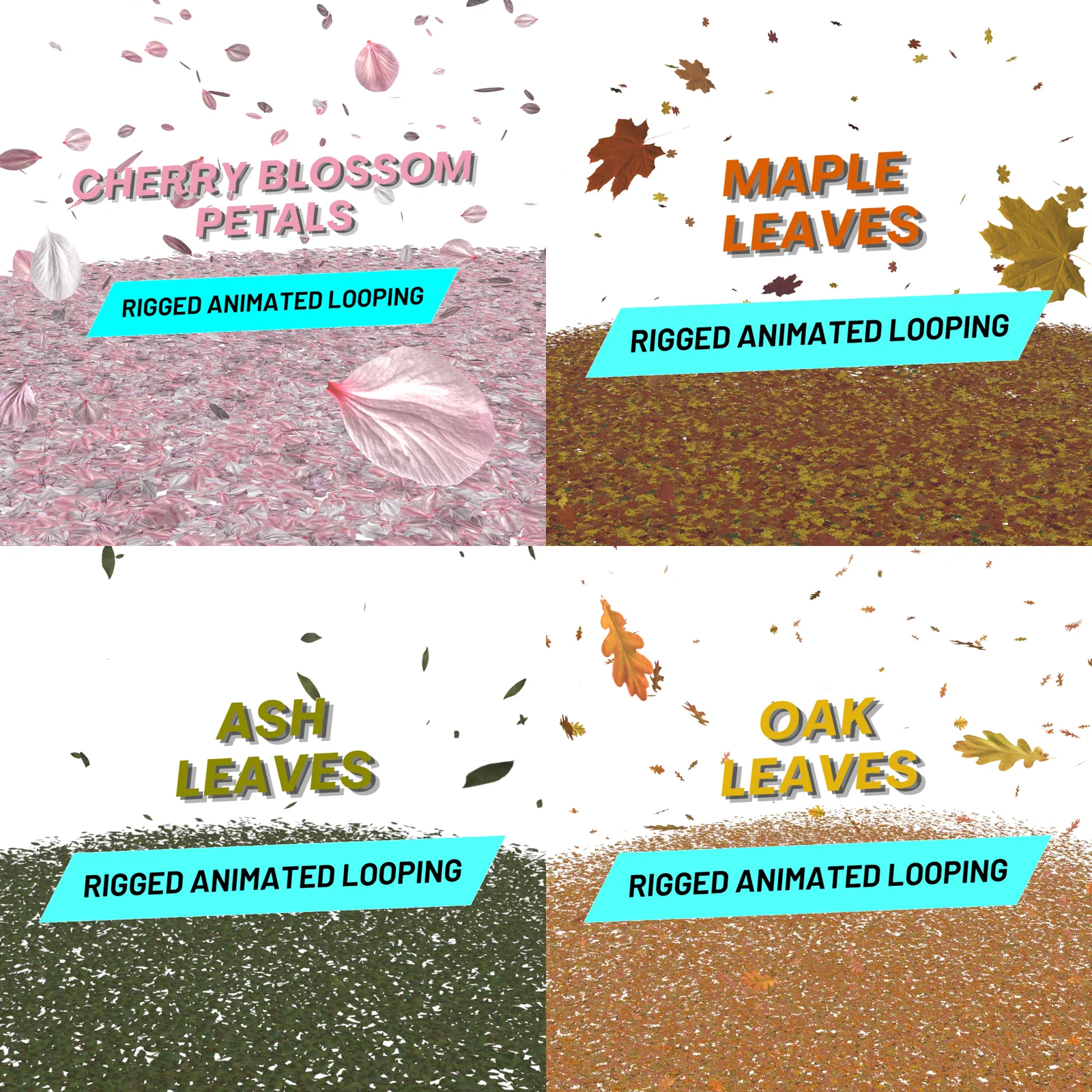 This collection contains 300-frame looping animations of falling leaves in a low-poly style. It includes four distinct leaf types: cherry blossom petals, maple leaves, ash leaves, and oak leaves. The animated area covers a volume of approximately 11.5 cubic meters. The models use PBR textures including base color, alpha, roughness, and normal maps. An additional static object of scattered ground leaves is also provided.
