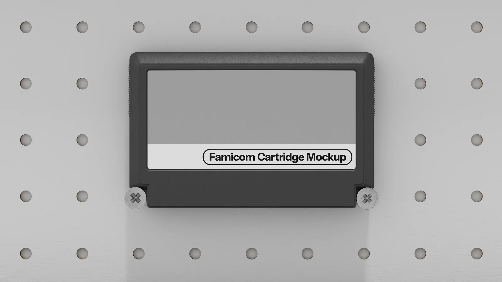 A complete 3D mockup scene featuring a Famicom game cartridge. Modeled accurately at a 1:1 scale, the project includes fully customizable materials and editable textures. The file is organized with a pre-configured camera setup, allowing users to easily drop in their own label designs and render product shots.