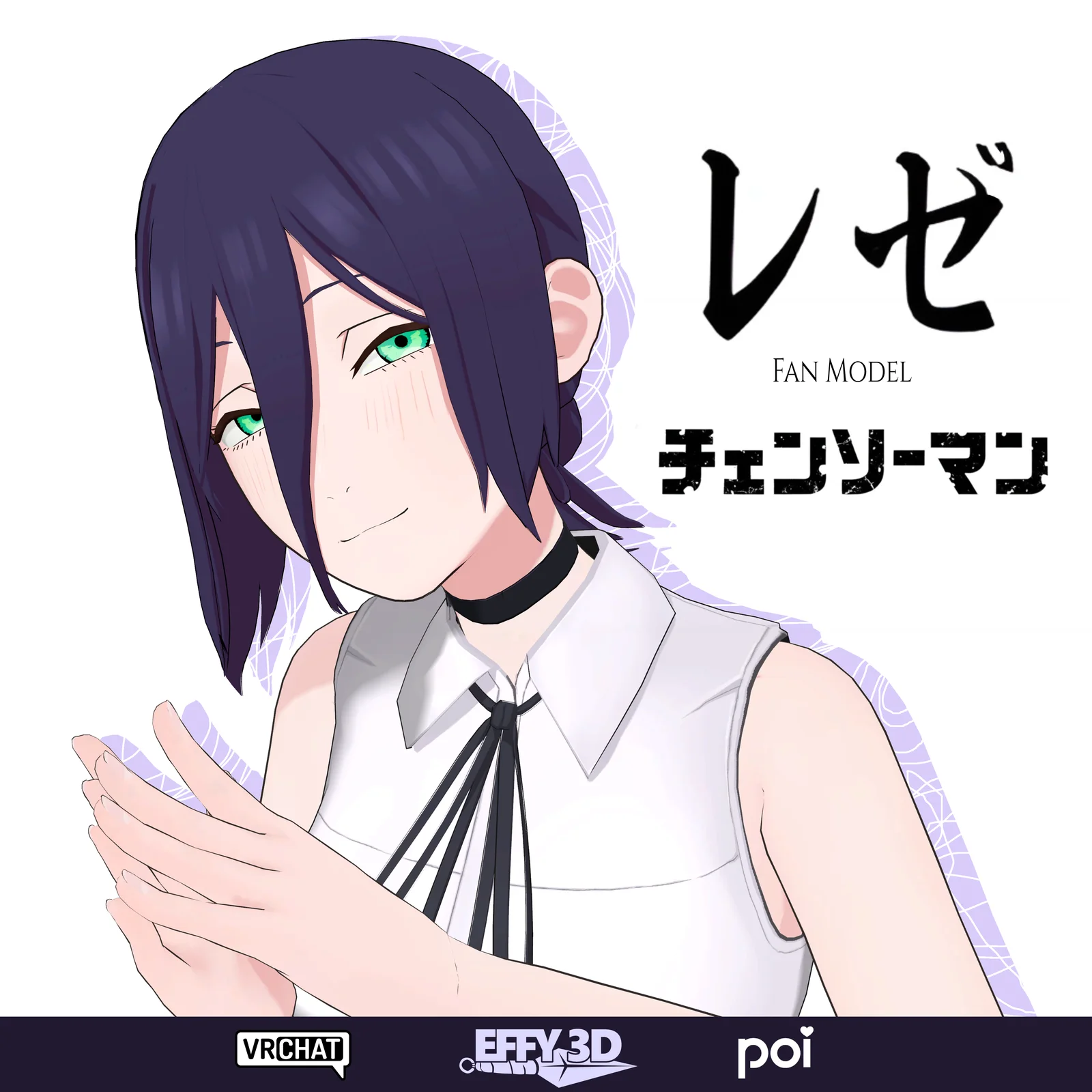 A rigged 3D character model of Reze from Chainsaw Man, provided as a .blend file for renders and animation practice. The model features a basic humanoid rig in a T-pose, comprising 31,877 faces, and includes 28 shape keys for mouth and eye variations. It comes with basic diffuse BSDF materials and seven original PNG texture maps. The Blender file does not include pre-configured physics, auto lip-sync, or animation controllers.
