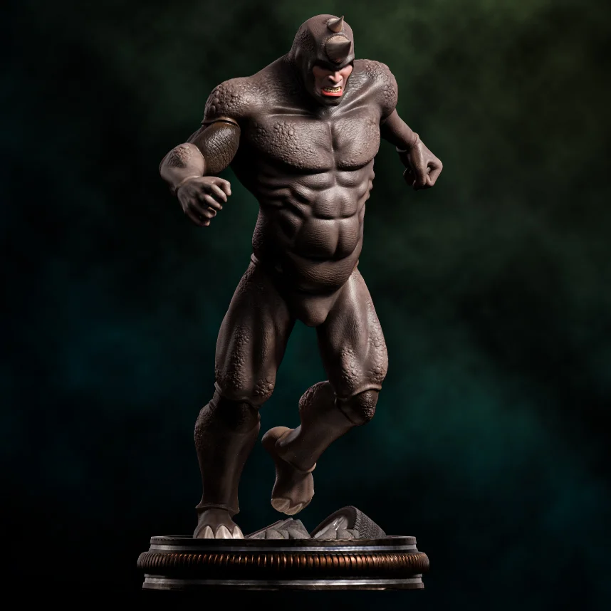This is a 3D printable fanart statue model of Rhino, based on his traditional comic book design. The digital sculpture features detailed texturing across the character's surface.