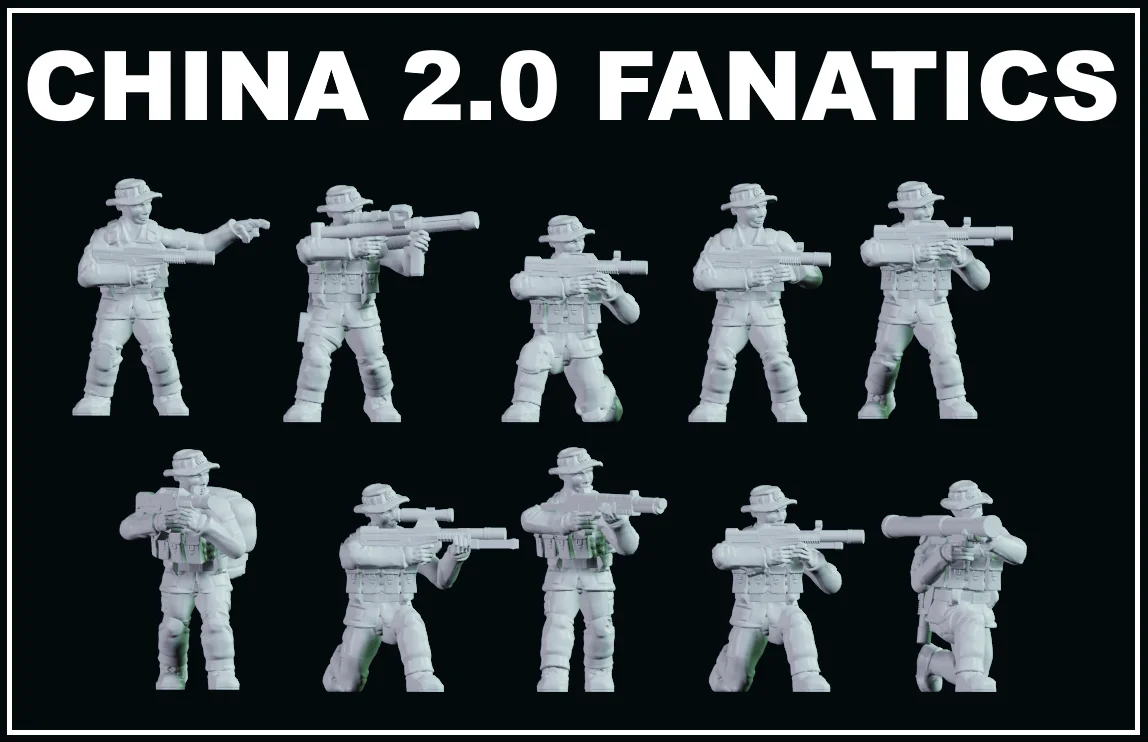 A collection of 1/100 scale 3D miniature models depicting Chinese PLA soldiers wearing boonie hats with badges. The figures measure 18mm from toe to the top of the head and are tailored for tabletop gaming and diorama creation.
