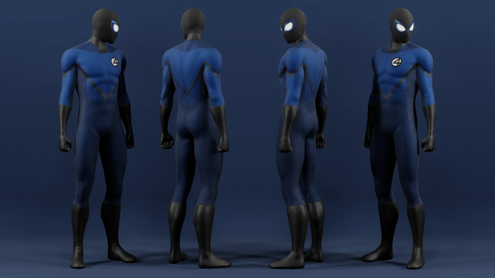 This texture pack provides a suit design inspired by the 2005 Fantastic Four movie, specifically tailored to fit The Lair Shop's Male Base 3D model. The package contains high-resolution 4K image maps for base color, normals, metallic, and roughness channels to construct a complete PBR material. This product includes texture files only and does not contain the underlying 3D character model.