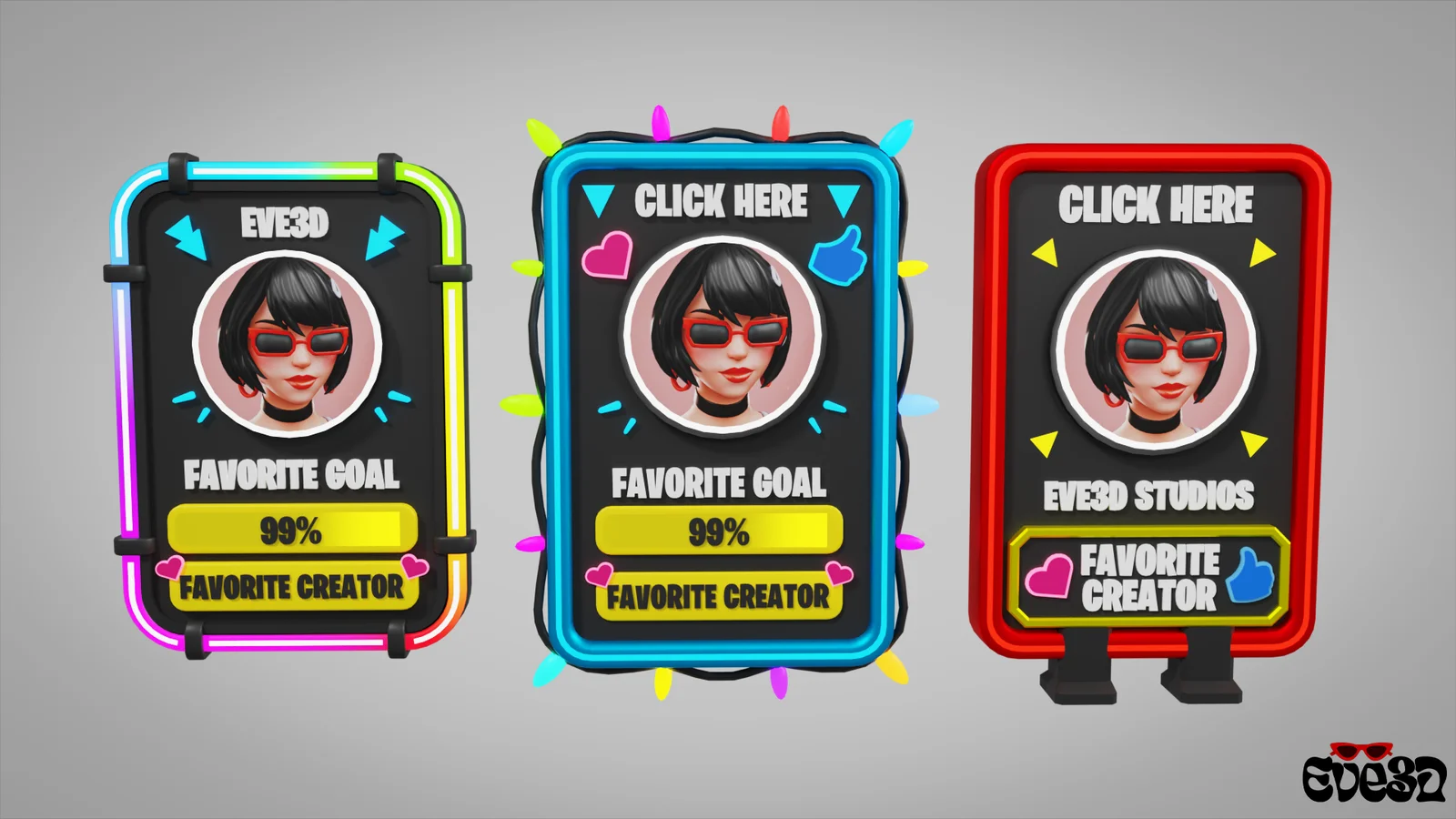 This product contains three 3D models of favorite creator cards designed for use in Unreal Editor for Fortnite (UEFN) projects. The provided Blender files allow users to edit the text on the cards prior to export. Each card model features customizable materials and is optimized for game performance, with vertex counts ranging between 8,000 and 12,000.