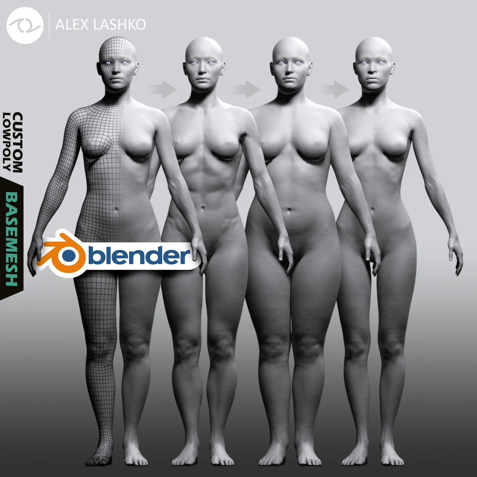 A customizable low-polygon female basemesh designed to serve as a starting point for character creation. The core mesh features an optimized, subdivision-ready edge flow to facilitate rigging, along with clean, non-intersecting UV layouts. It includes placeholder geometry for eyeballs, teeth, and the tongue.