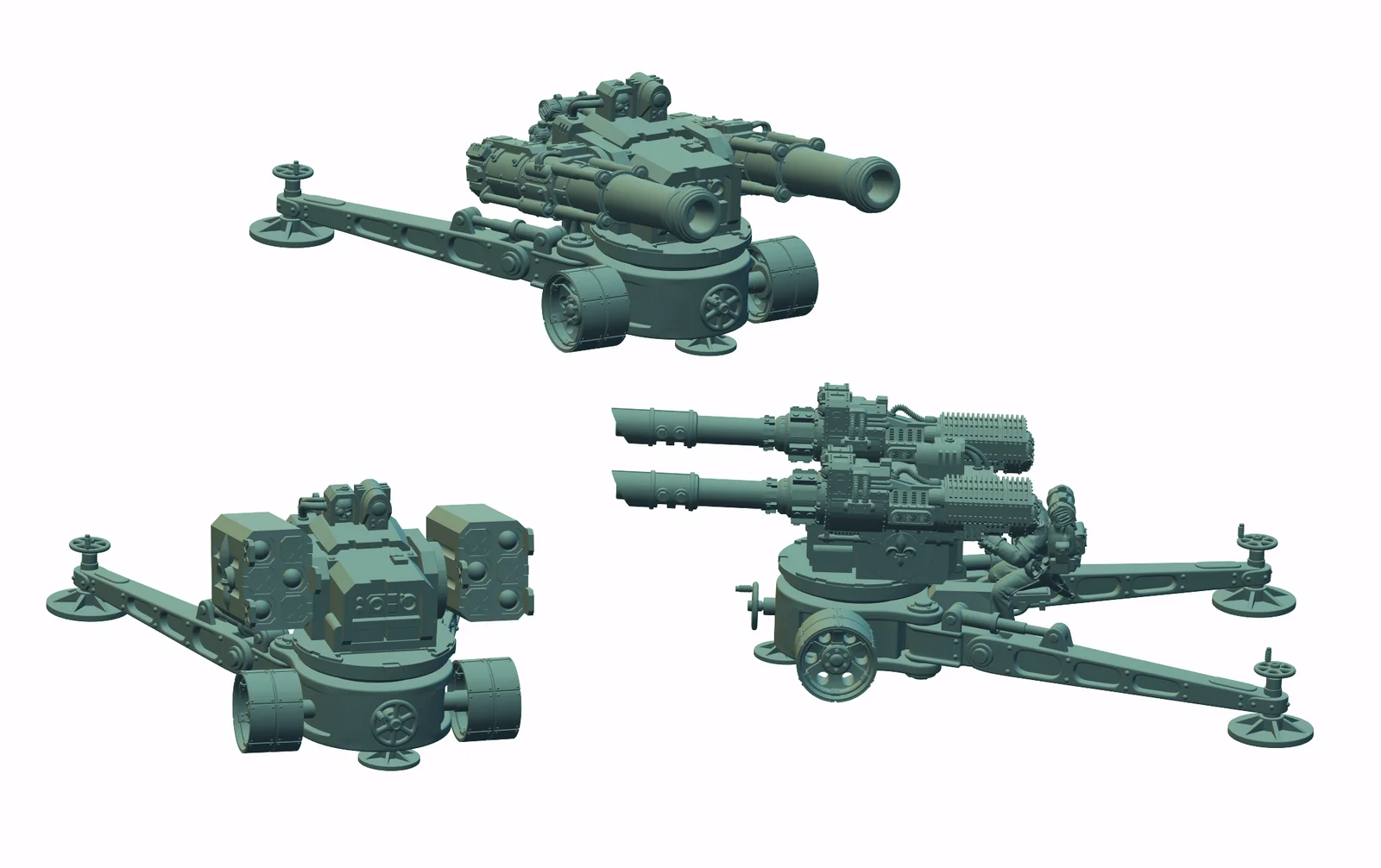 This collection contains three 3D printable artillery models designed for tabletop gaming. The set includes a Hwacha Rocket Launcher system, a Heavy Energy Blaster, and a Battlefield Cannon. The files are provided in both pre-supported and unsupported formats for 3D printing.