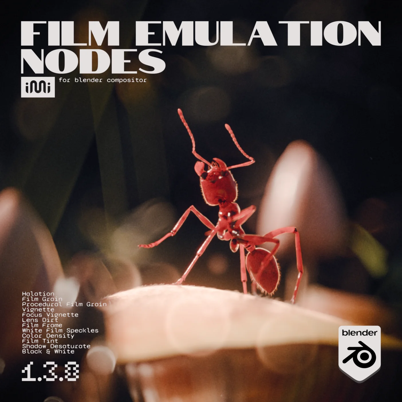 Film Emulation Nodes provides a package of custom node groups for Blender's Compositor designed to replicate traditional cinematic aesthetics. The setup includes tools for introducing analog imperfections such as halation around bright light sources, lens dirt, white film speckles, and both procedural and scanned movie film grain.