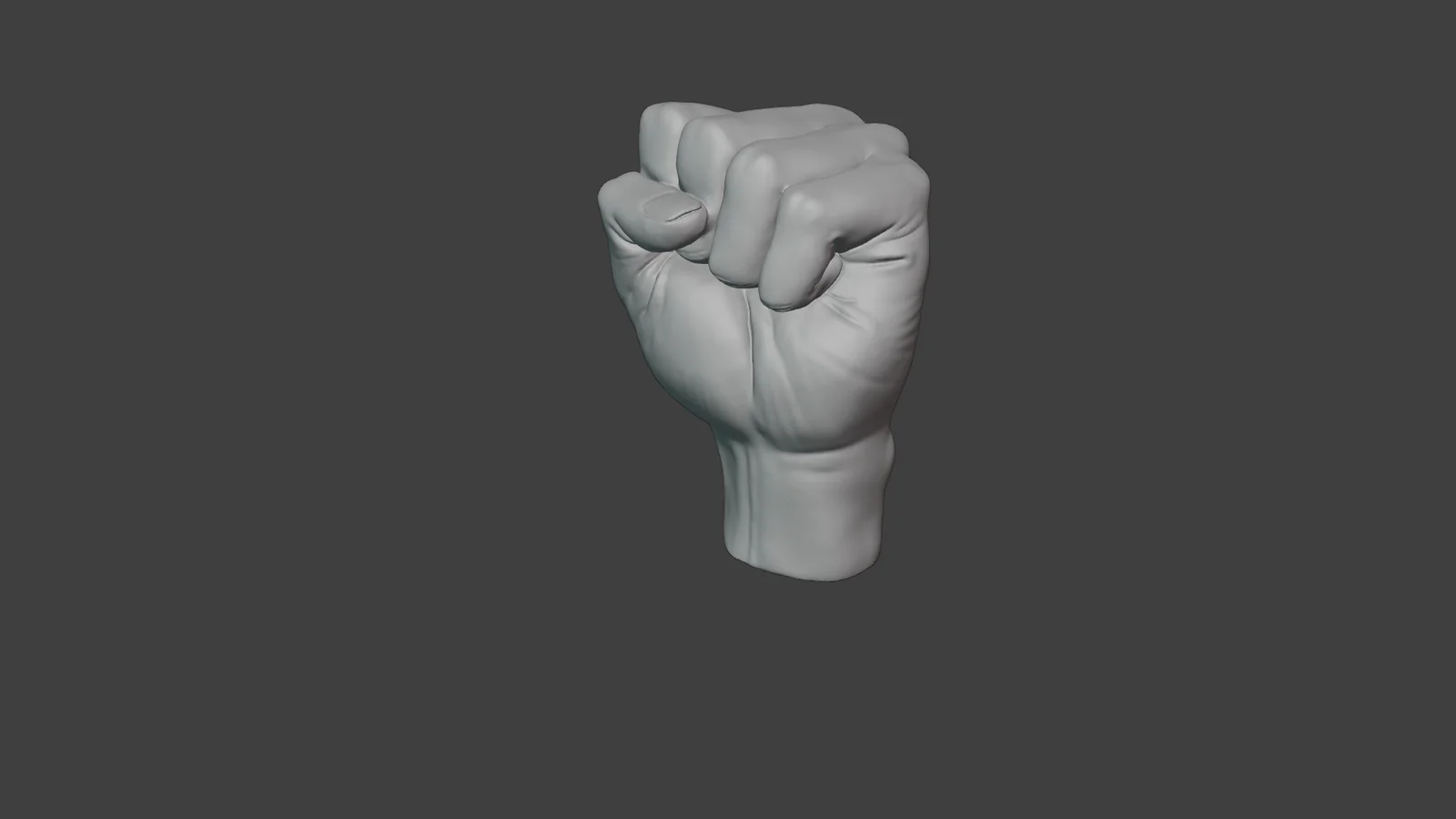 A sculpted 3D model of a human fist intended for 3D printing. The mesh is unoptimized, making it unsuitable for use in real-time games or keyframe animation.