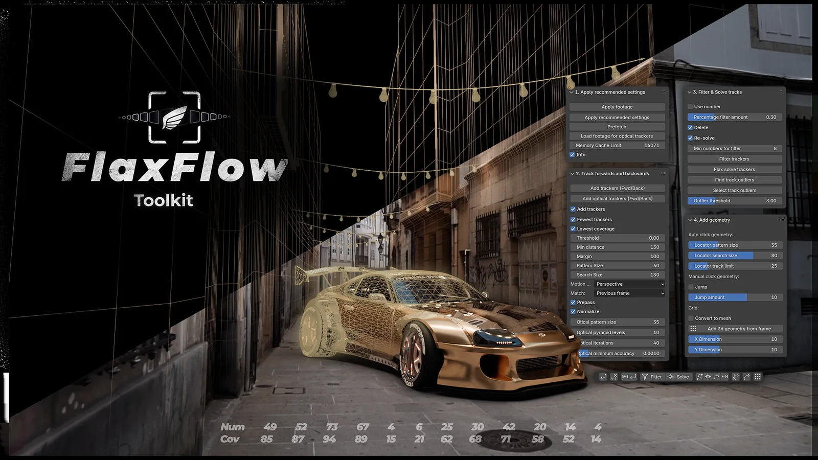 FlaxFlow extends Blender's motion tracking panel and 3D viewport with an optical flow tracking system, automated filtering tools, and geometry generation utilities. The optical tracking system provides an alternative to Blender's native tracking to maintain tracking continuity across footage. The toolkit reduces manual tracking tasks by offering single-click operations for adding trackers backward and forward, applying recommended settings, and filtering track outliers based on movement deviation.